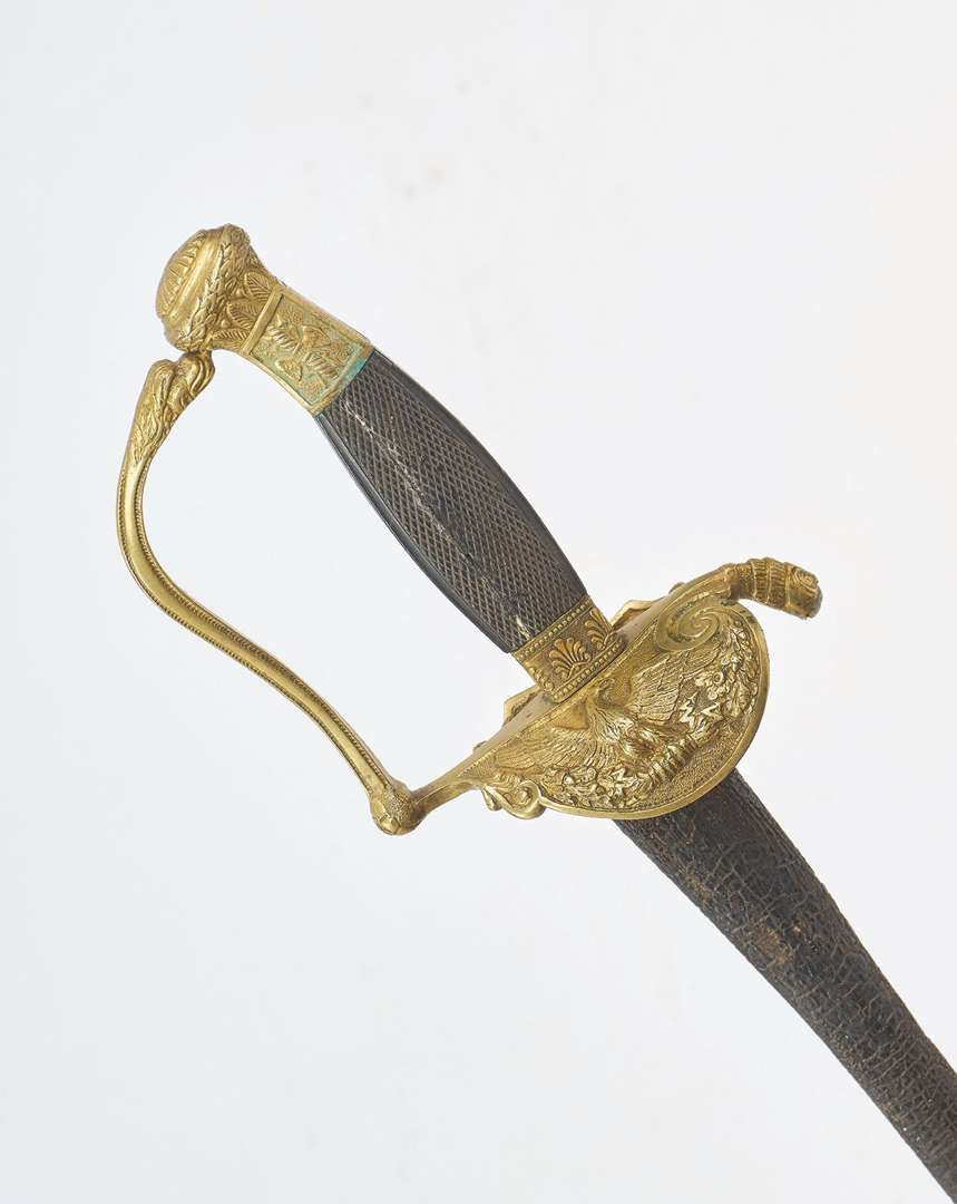 EMPIRE Monture en laiton. Pommeau au bâton de foudre, arc de jointure en forme de serpent et quillon à tête zoomorphe. Clavier à l'aigle impériale ailes déployées. Lame droite à section triangulaire (mauvais état).