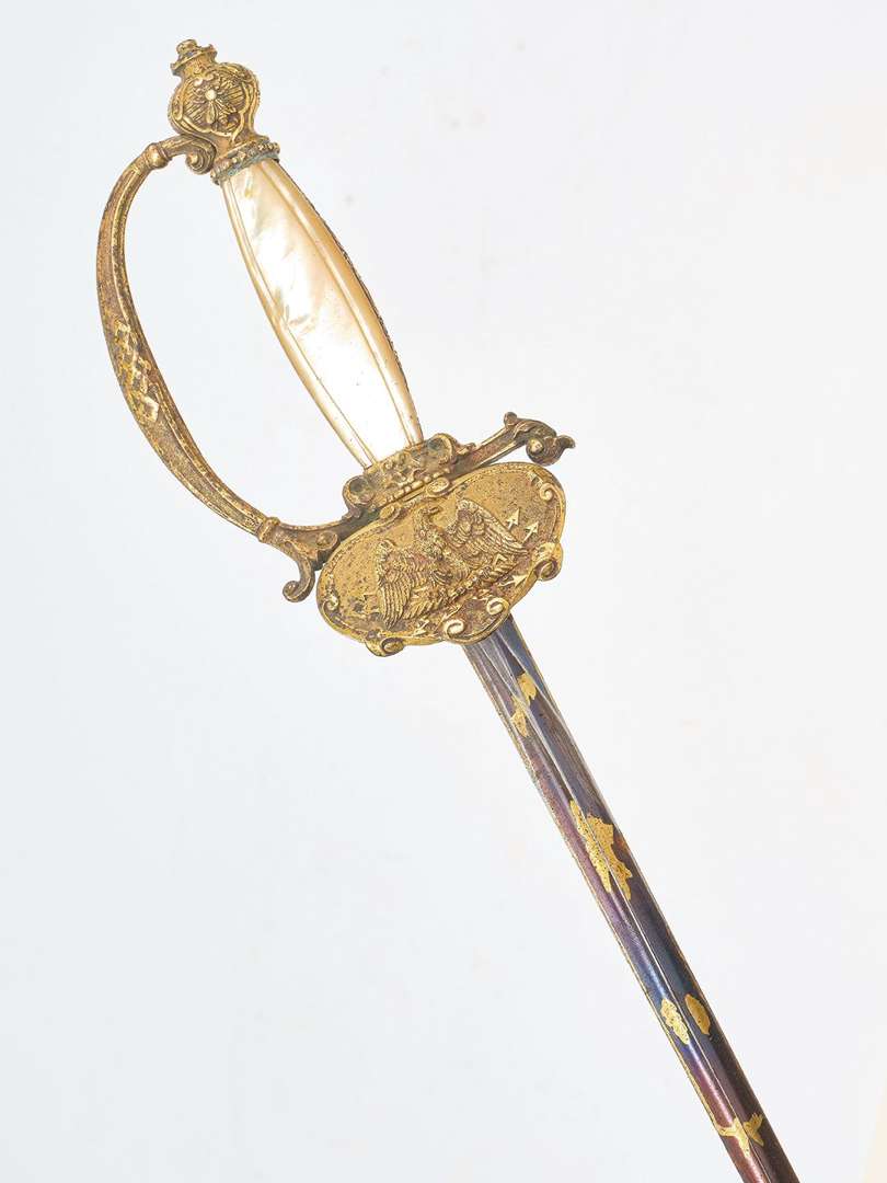 ÉPÉE D'OFFICIER DES POUDRES ET SALPÊTRES SECOND-EMPIRE Monture en laiton doré. Pommeau à décor d'une abeille, arc de de jointure décoré d'une frise de perles avec quillon droit dans le prolongement. Clavier à l'aigle impériale et foudres. Plaquettes en nacre. Lame droite à section triangulaire.