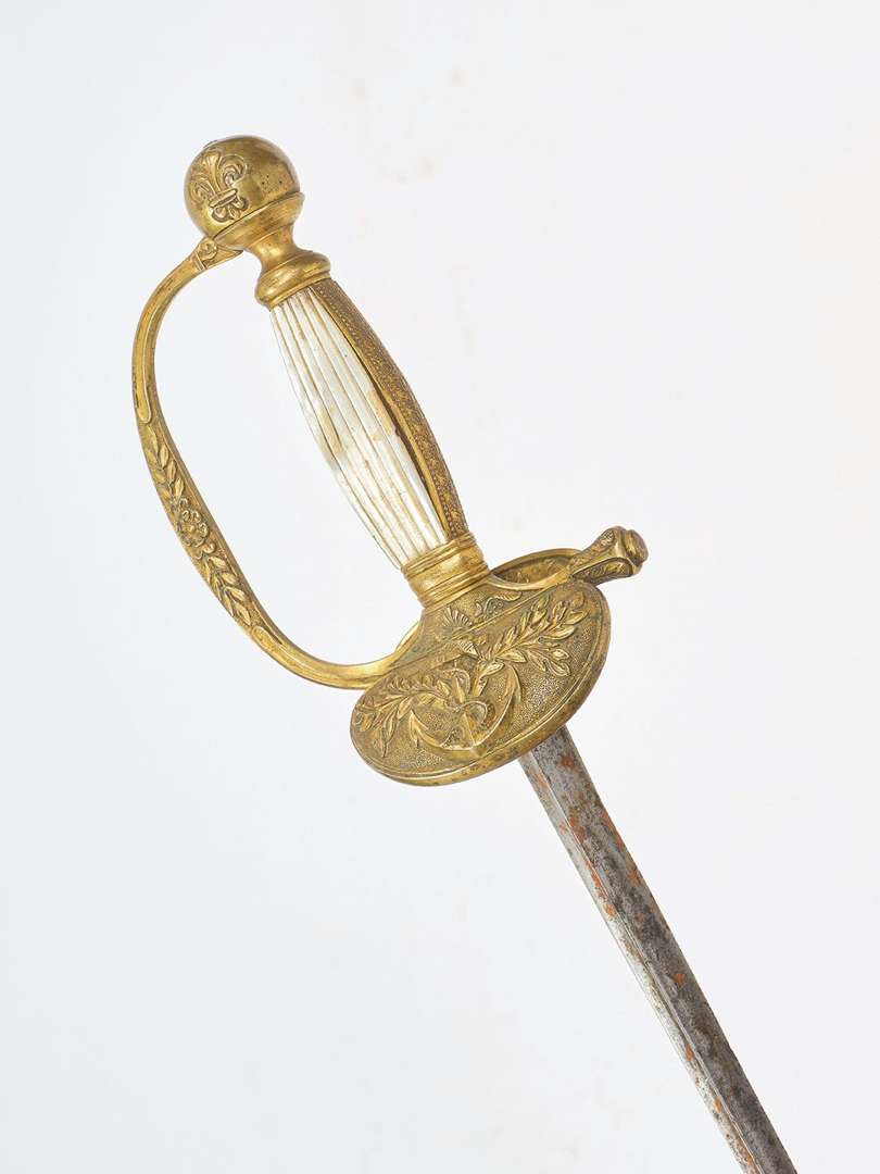 Pommeau à la fleur de lys rond relié à l'arc de jointure et quillon dans le prolongement.