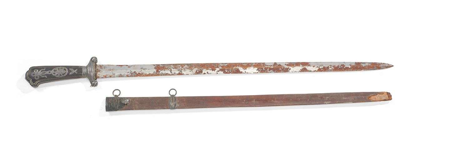 Lame droite à pans creux et double tranchant, oxydations. Fourreau en bois recouvert de cuir brun à trois garnitures argent (manque la bouterole).