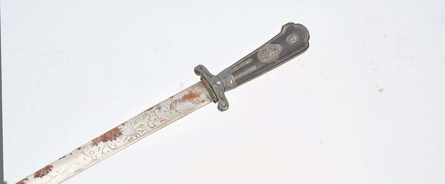 Lame droite à pans creux et double tranchant, oxydations. Fourreau en bois recouvert de cuir brun à trois garnitures argent (manque la bouterole).