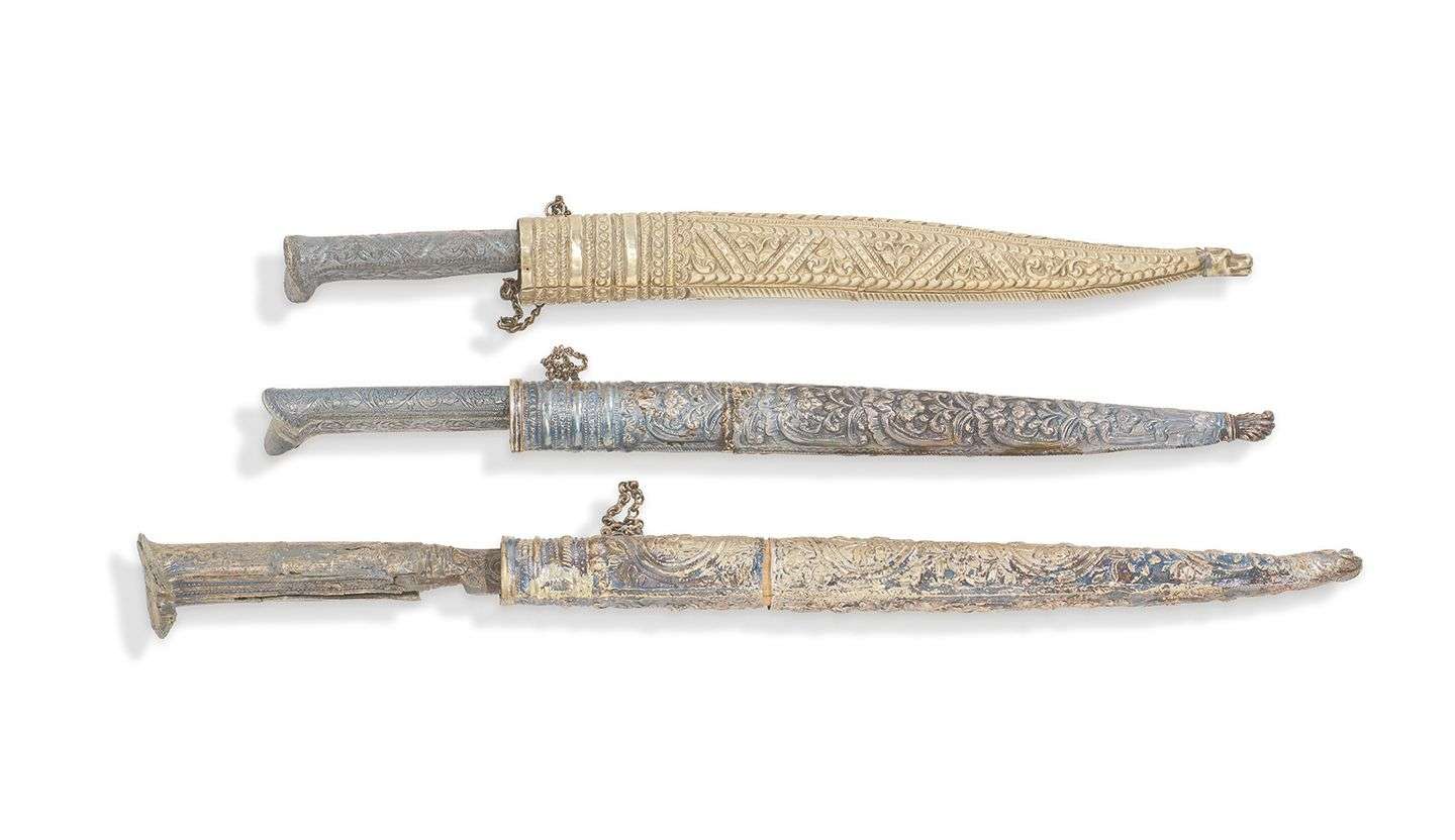 TROIS PETITS POIGNARDS YATAGAN Montures en feuilles d'argent repoussé.