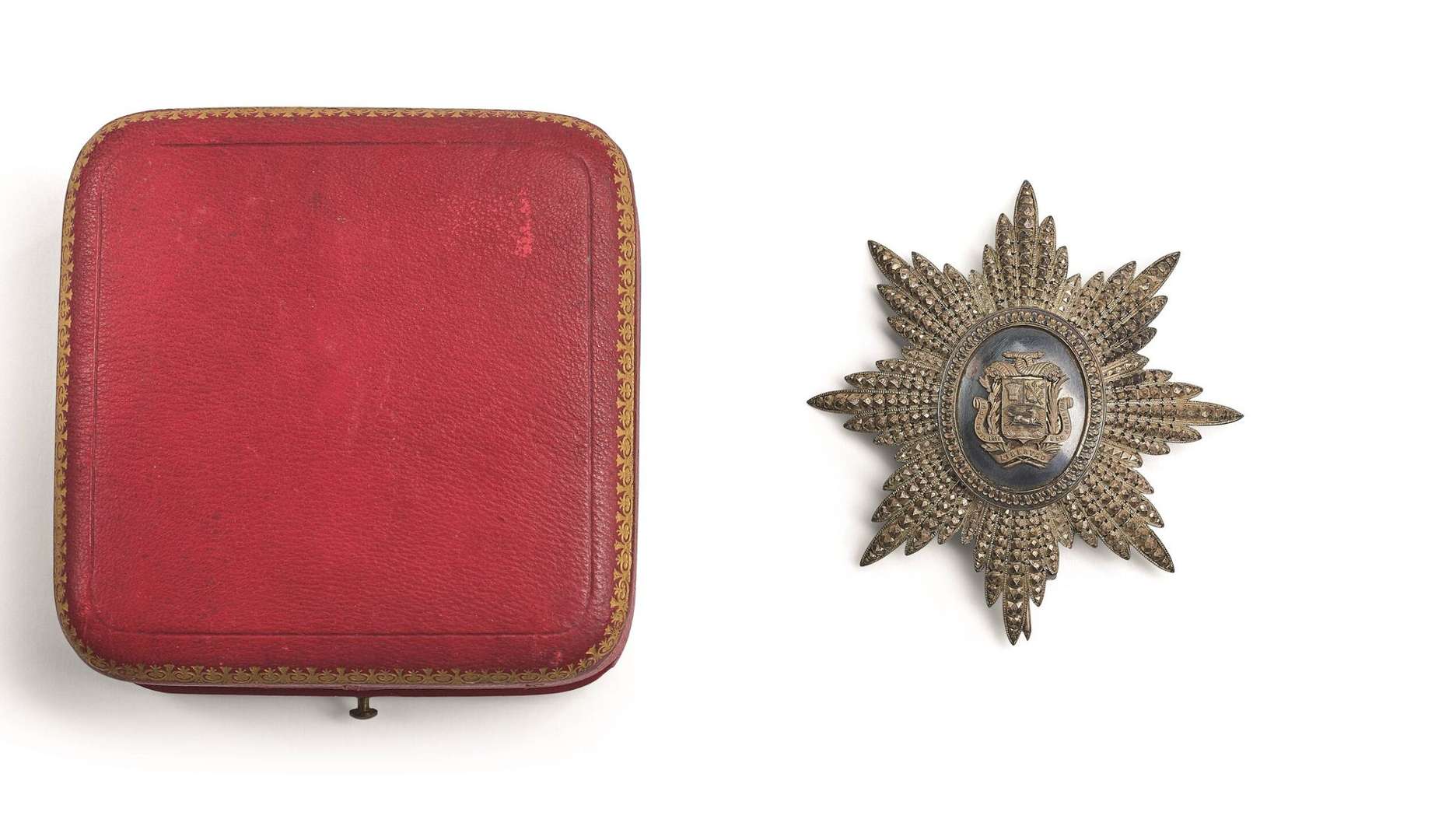 Plaque en argent. Fabrication Lemaitre à Paris. Centre aux armes sur fond rayonnant taillé en pointe de diamants.