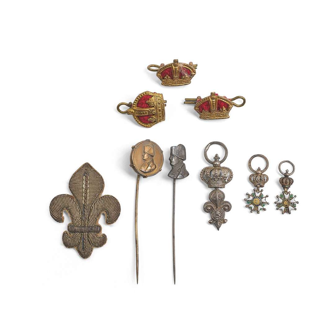 -on y joint une fleur de lys brodée en passementerie or, deux épingles à cravate à l'effigie de l'Empereur Napoléon, ainsi que trois insignes à la couronne, britannique.