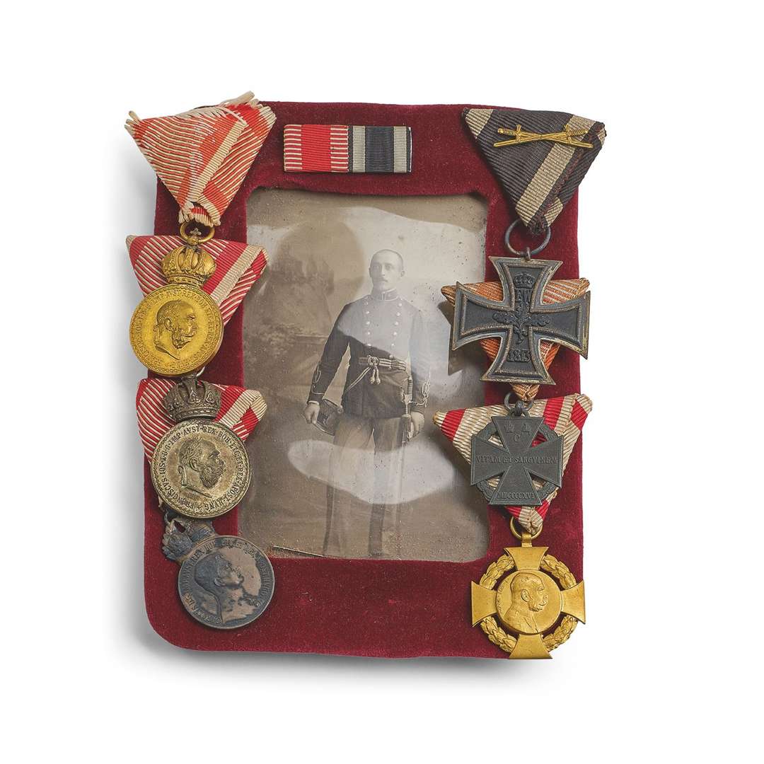 PORTRAIT PHOTOGRAPHIQUE D'OFFICIER EN UNIFORME Dans un cadre bordé de velours orné de cinq médailles :