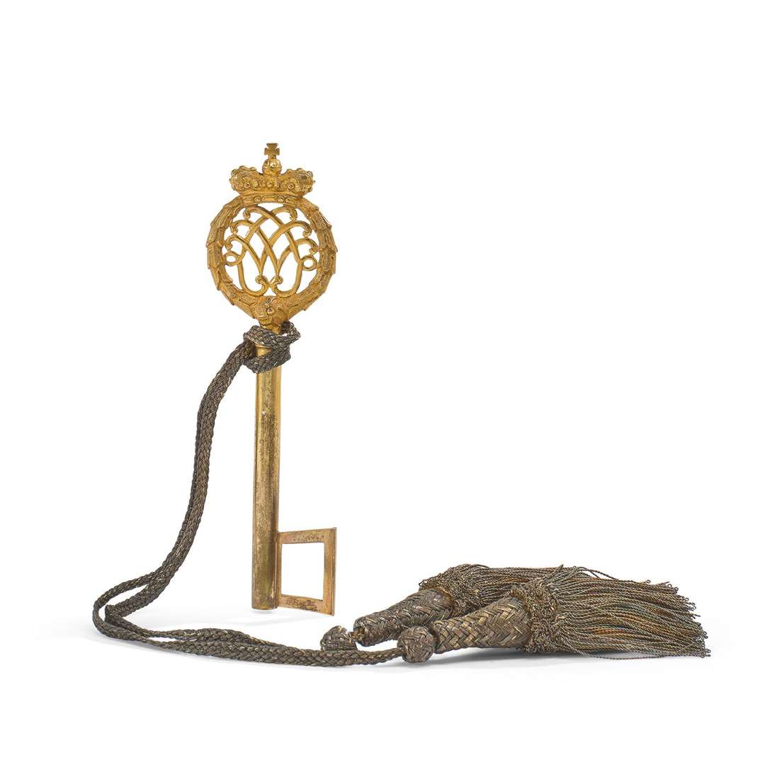 CLEF DE CHAMBELLAN en bronze doré, la tête ajourée au monogramme LV en mavelot inscrit dans une couronne de lauriers surmontée d'une couronne de prince germanique.