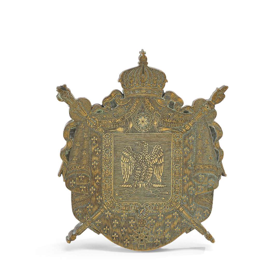 FER À DORER AUX GRANDES ARMES IMPÉRIALES du Second Empire en bronze gravé, la devise « Empire Français » lisible dans la chaine du grand collier de la Légion d'Honneur.