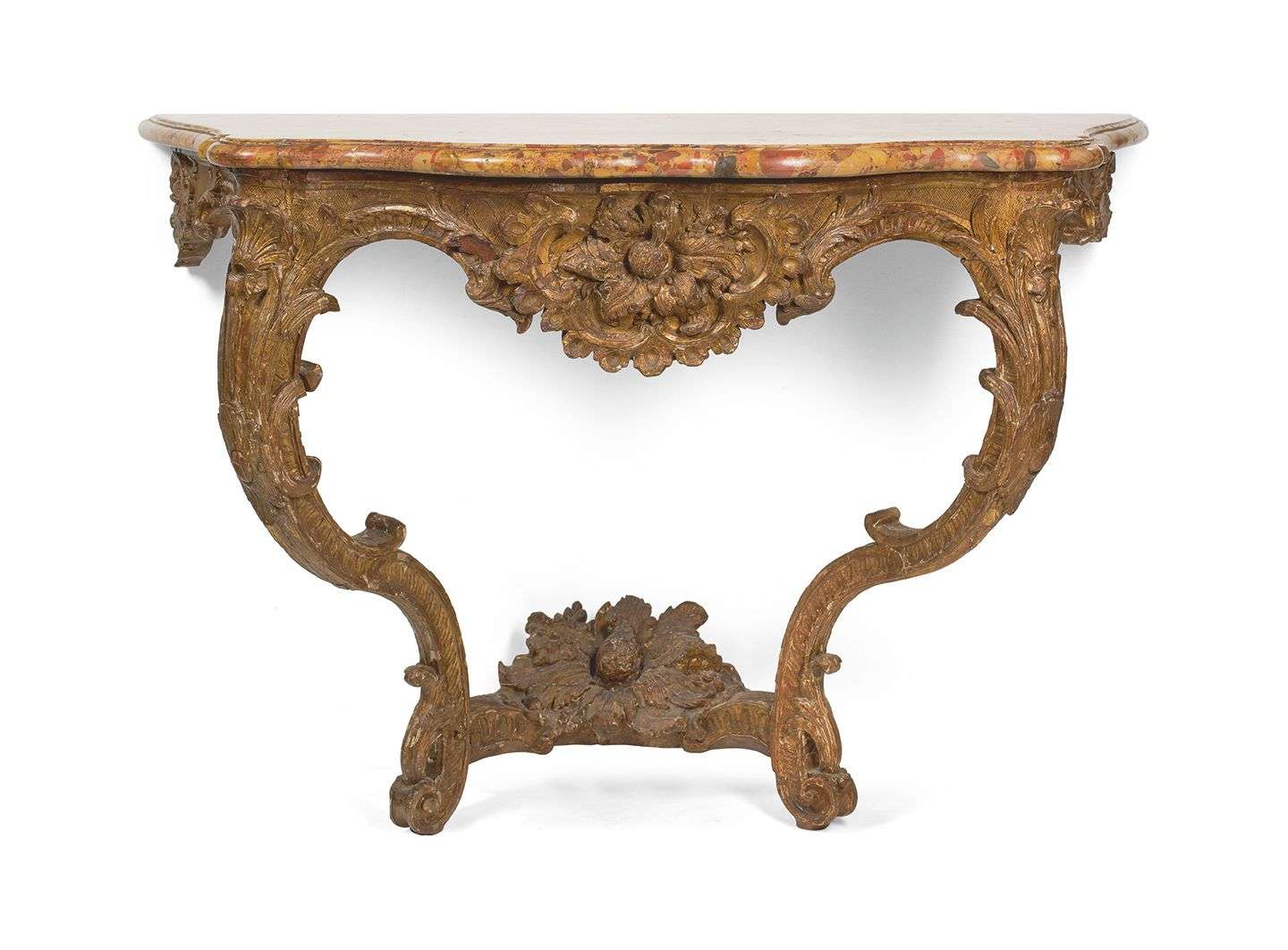 CONSOLE en bois sculpté et doré, ceinture à bouquet de graine fleurie, les deux pieds en console réunis par une entretoise à la graine fleurie. Dessus de marbre brèche d'Alep (rapporté).