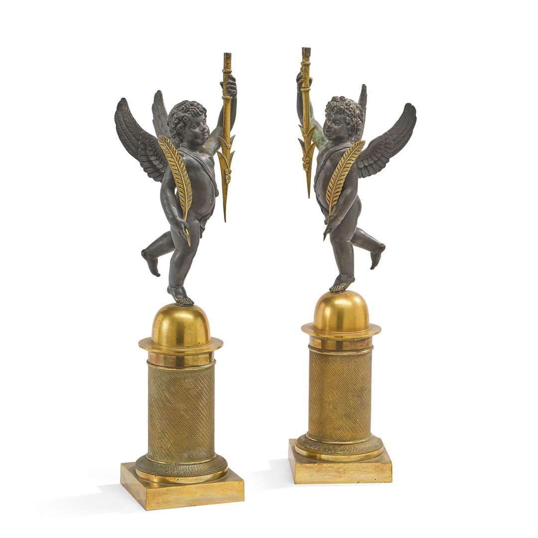 DEUX BASES DE CANDÉLABRES AUX AMOURS VAINQUEURS en bronze ciselé doré et bronze patiné noir. Les Amours ailés tenant des palmes et les bases des bouquets de feux (manquants).