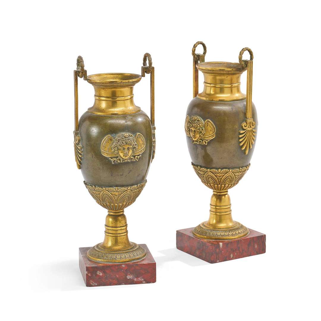Les anses à la grecque terminées par des palmettes et sommées de couronnes de lauriers. Bases en marbre rouge griotte.