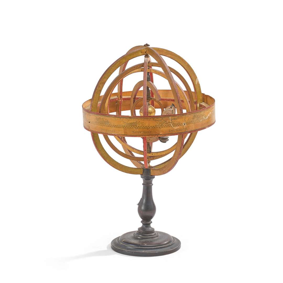 SPHÈRE ARMILLAIRE PLANÉTAIRE en carton bouilli et papier lithographié réhaussé. Exposition du système héliocentrique de Copernic avec soleil doré central, cercles mouvants des planètes, de Mercure à Saturne avec Terre et Lune amovibles.