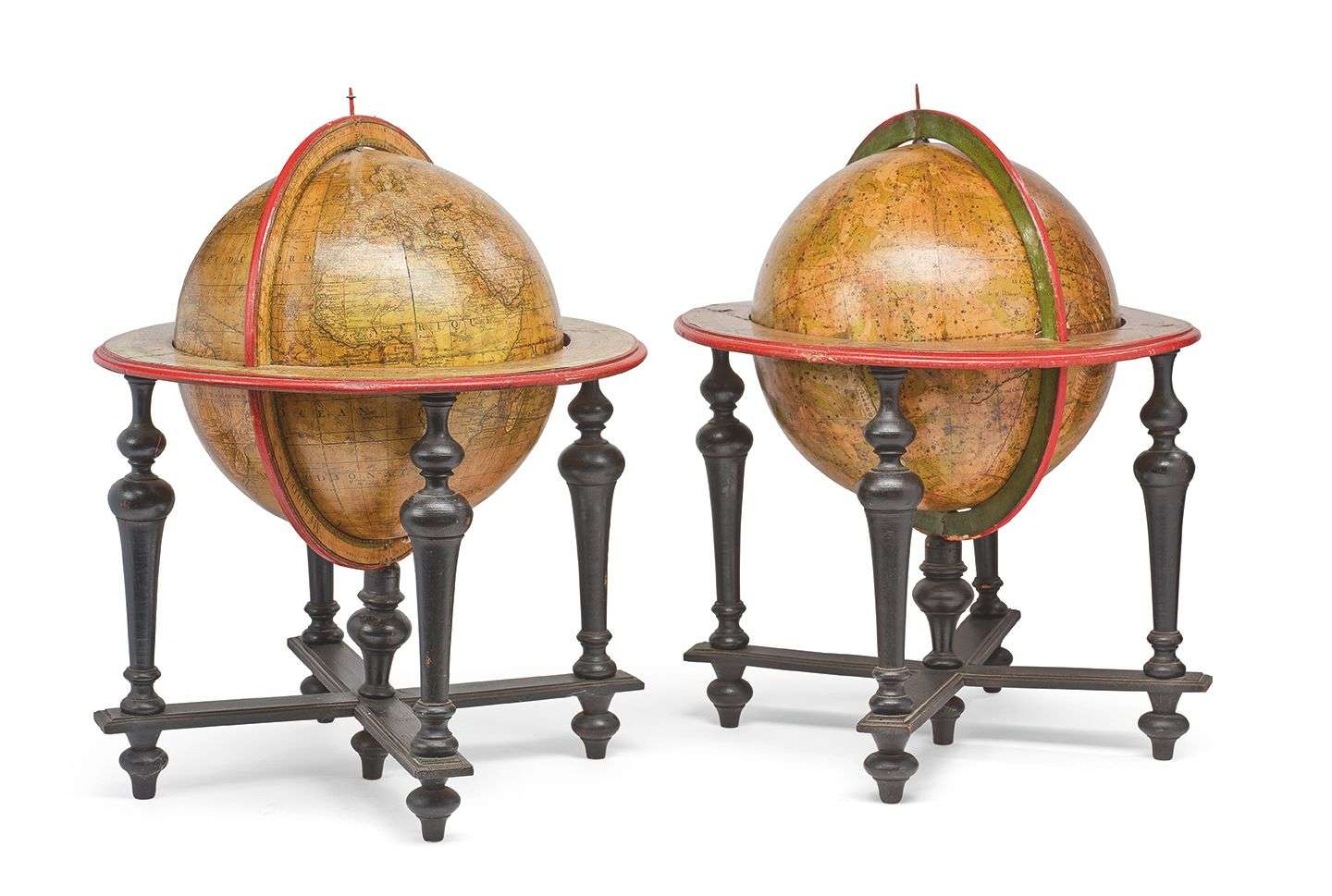 DEUX GLOBES DITS « DE BIBLIOTHÈQUE » en pendants, représentant respectivement un globe terreste et un globe célèste, les deux en carton-plâtre avec papier lithographié, aquarellé et vernis. Les globes pivotent.