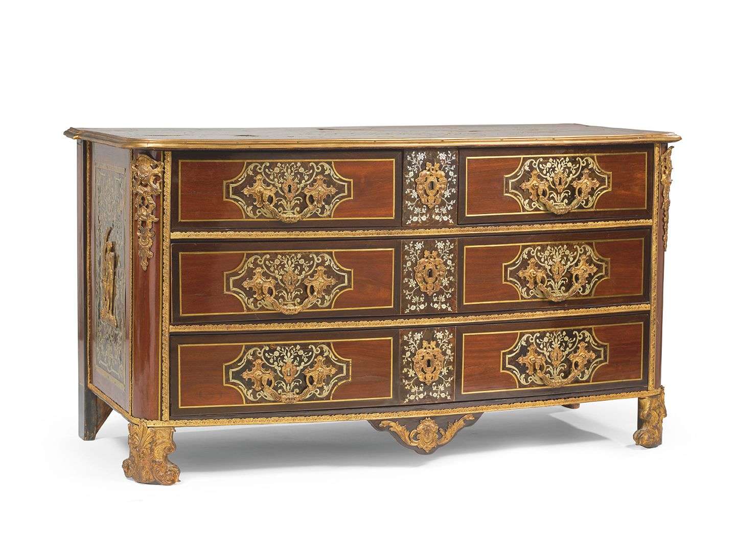 COMMODE LOUIS XIV ouvrant à quatre tiroirs sur trois rangs en bois de placage et décor marqueté en marqueterie d'étain gravé sur fond d'écaille brune dans des encadrements de laiton gravé. Fond de bois alternant acajou et amarante avec filets de laiton. Le décor du plateau gravé d'un couple de satlimbanques central dans un cartouche à riche ornements végétaux. Les côtés à bronzes dorés appliqués de jeune Bacchus, riches bronzes dorés en volutes aux pieds antérieurs.
