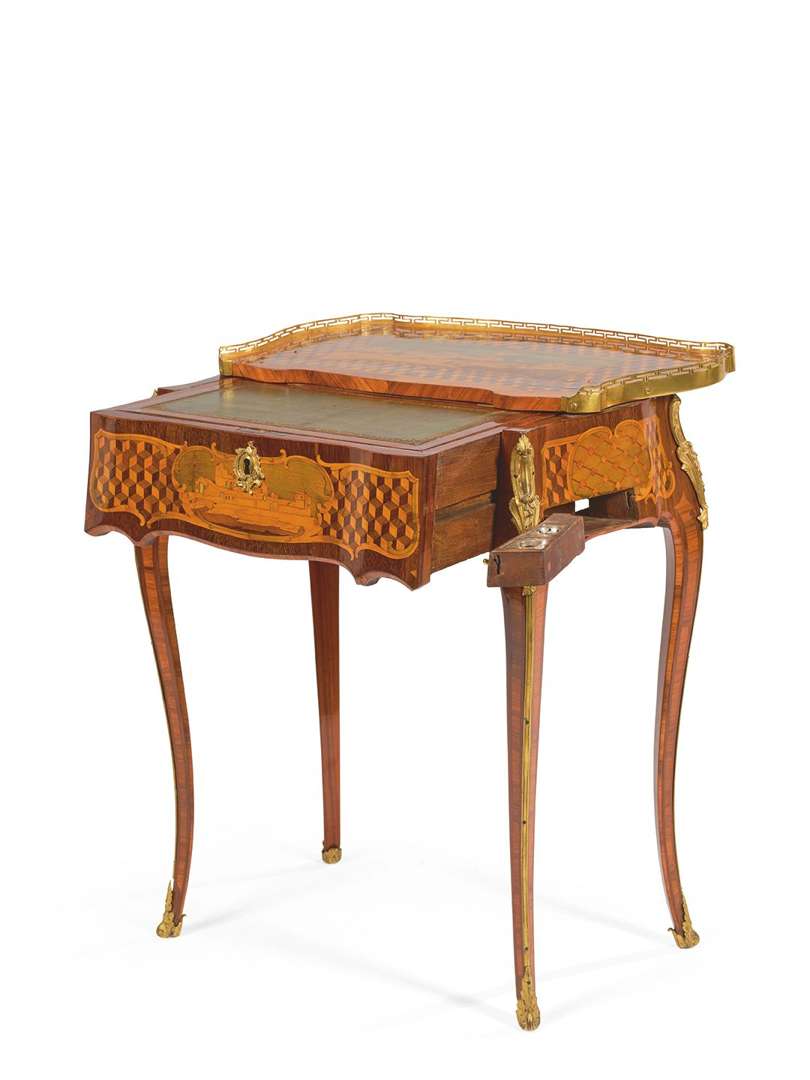 RARE TABLE À ÉCRIRE DITE « À LA POMPADOUR » de dame entièrement à décor de marqueterie géométrique de cubes et sur le plateau d'un paysage avec personnages et architectures dans une réserve ainsi que sur l'avant avec incrustations de nacre.