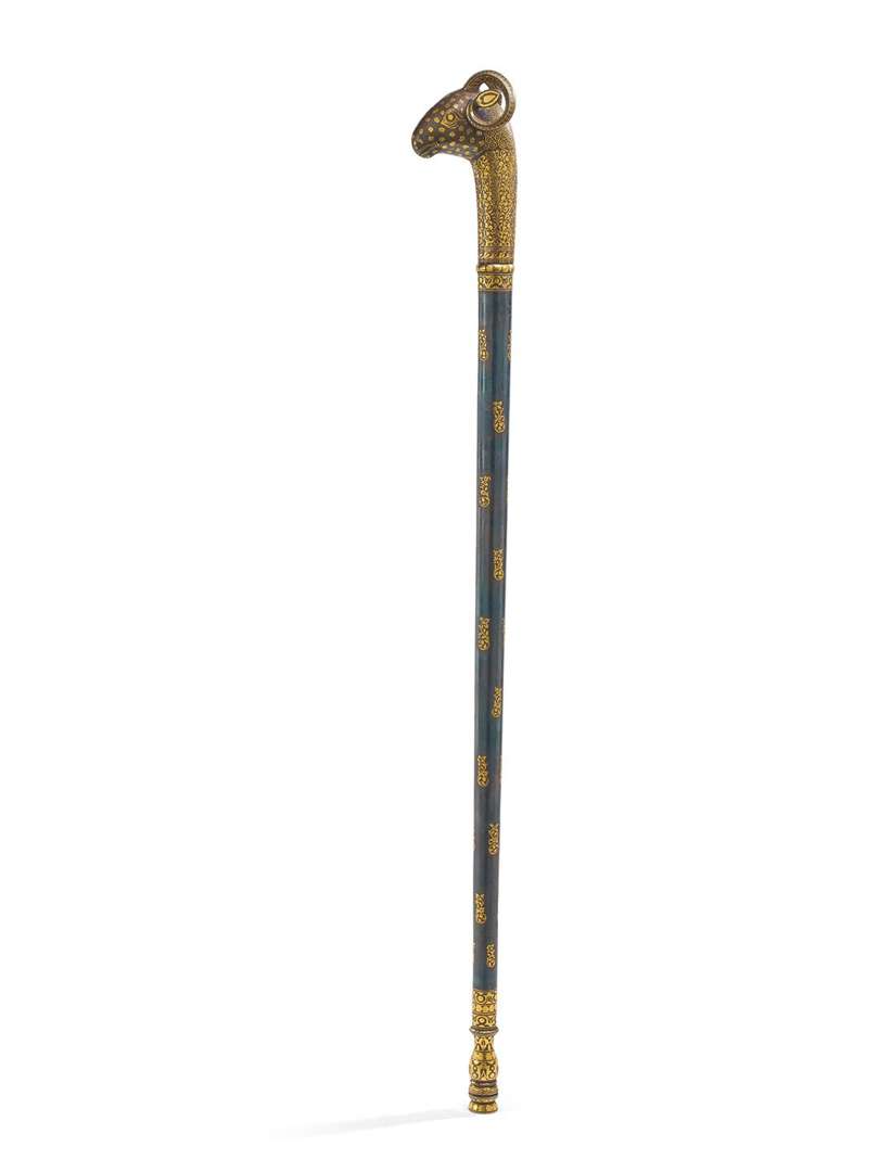 MASSE D'ARME en acier damas et acier bleui damasquiné d'or jaune, la tête en forme de bélier richement damasquinée d'or jaune se dévissant formant courte épée à lame damas. Fût bleui.