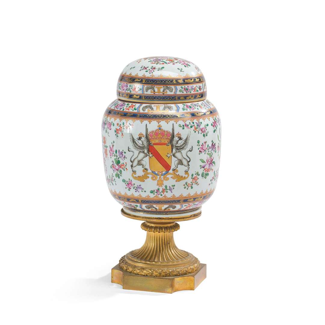 POTICHE COUVERTE en porcelaine blanche à décor peint de fleurs et pseudo-armoiries à l'imitation de la Compagnie des Indes. Monté sur un pied cannelé en bronze doré avec couronne de lauriers.