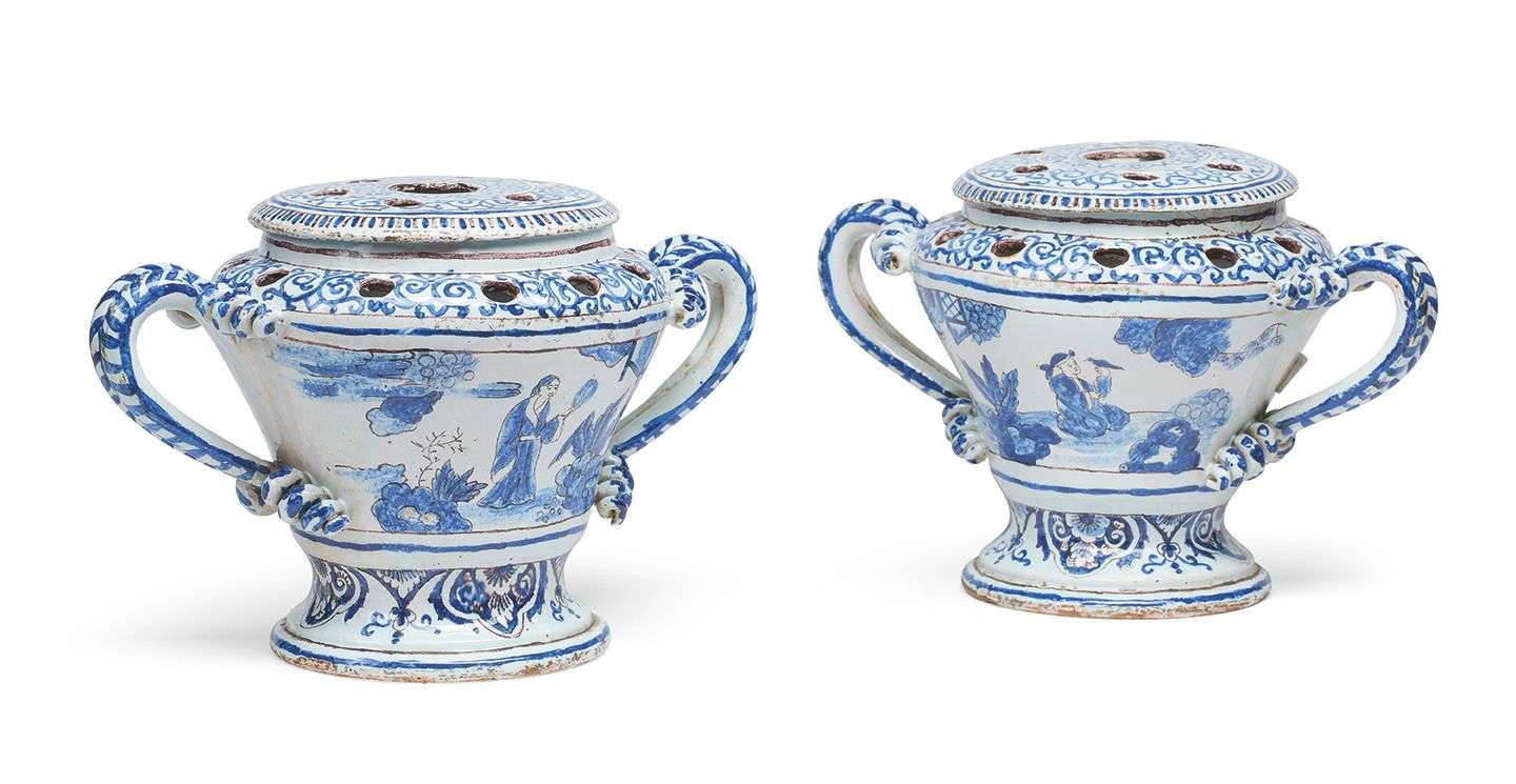 PAIRE DE BOUQUETIÈRES ou tulipières en faïence blanche à décor peint bleu et camaieu de bleu de scènes historiées aux personnages chinois. Elles ouvrent par un couvercle à décor de rinceaux qui est percé de sept trous. Douze trous supplémentaires en partie haute de la panse.