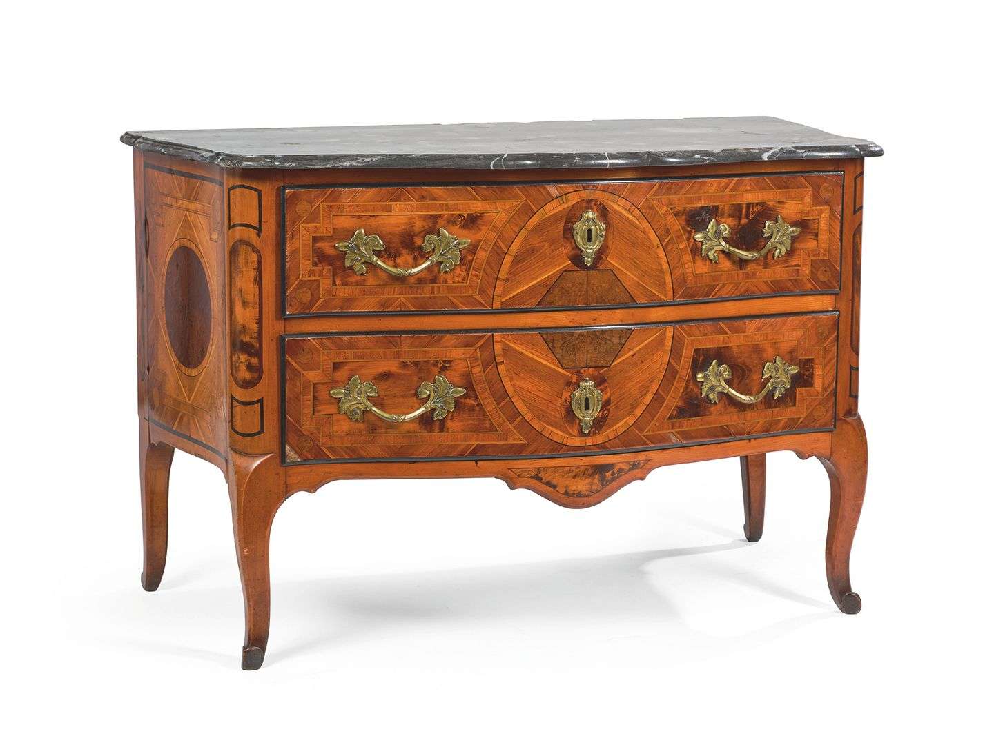 COMMODE SAUTEUSE en bois de placage de différentes essences, elle ouvre à deux tiroirs sur deux rangs légèrement galbés en façade, les côtés très légèrement galbés, et repose sur deux pieds antérieurs galbés terminés par des pastilles. Décor plaqué d'un grand médaillon ovale central comprenant un hexagone. Les poignées dans des réserves plaquées de loupe.