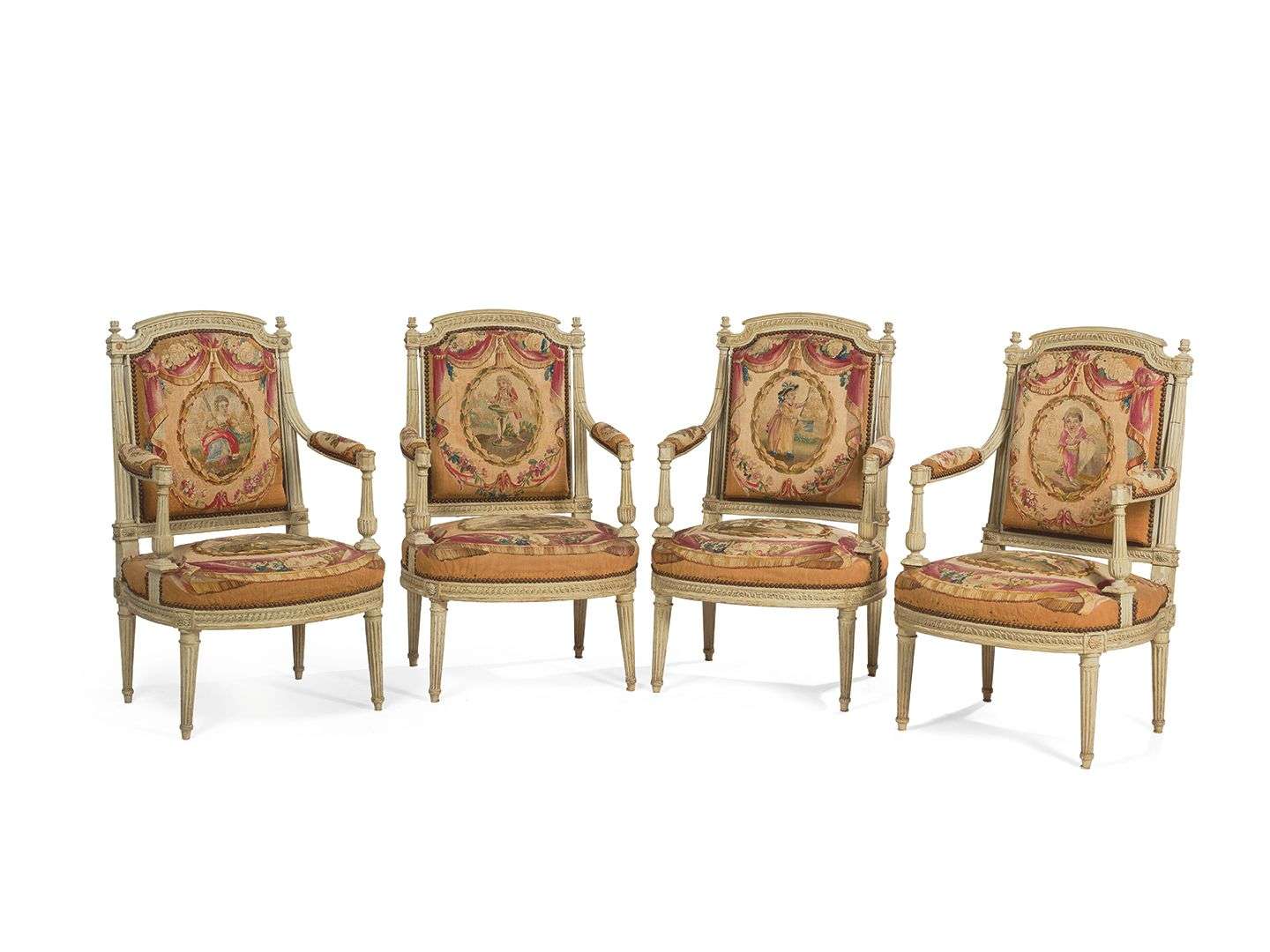 SUITE DE QUATRE FAUTEUILS en bois sculpté et laqué crème. Les dossiers en chapeau de gendarme, les montants et supports d'accotoirs en forme de colonnes, la ceinture arrondie et les pieds fuselés et cannelés.