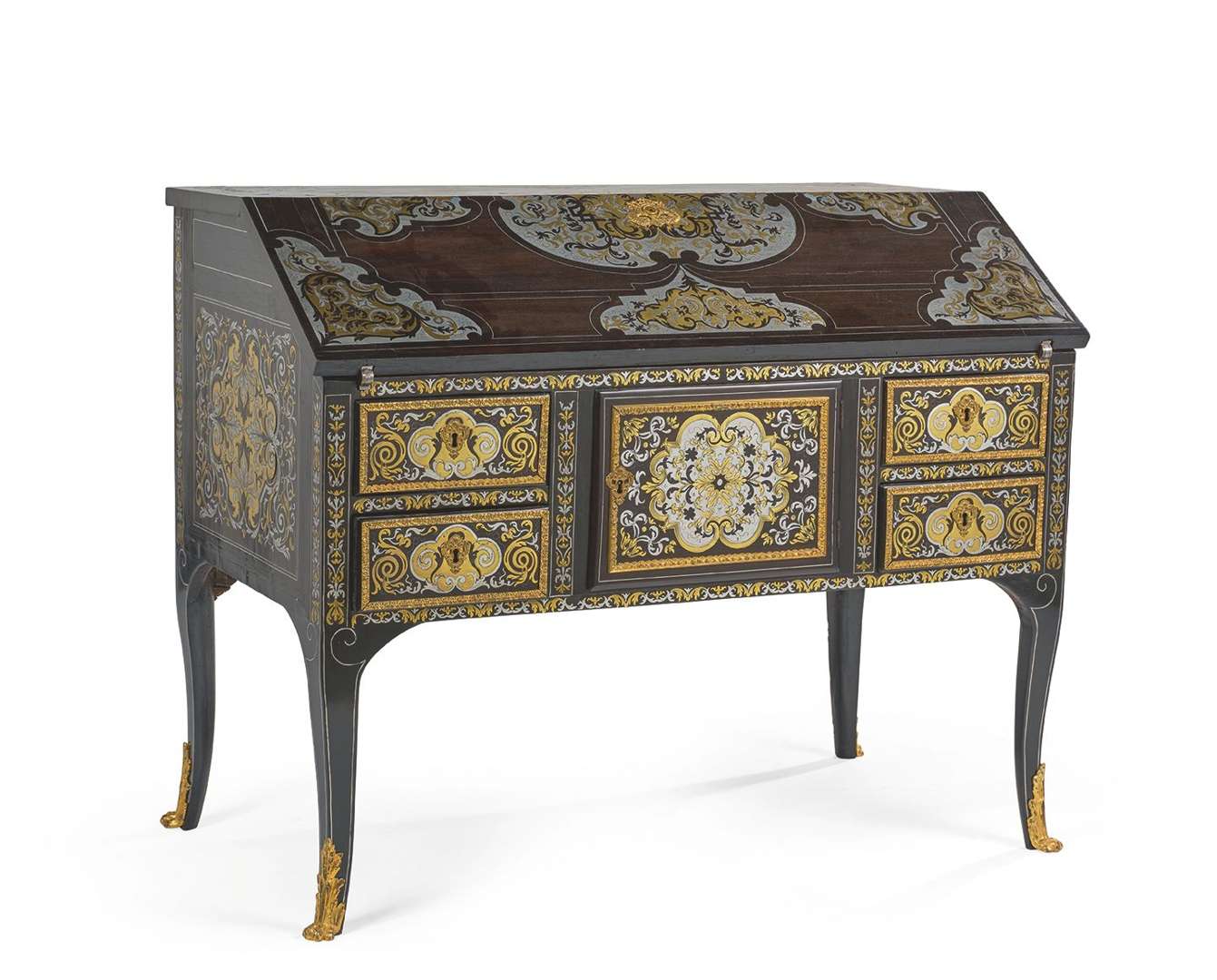 BUREAU DE PENTE en bois noirci à décor en marqueterie dite "Boulle" en étain et laiton de volutes et rinceaux feuillagés sur placage de bois noirci. La ceinture à deux tiroirs et un casier central. L'abattant découvrant une surface de travail à décor marqueté de bois comprenant quatre tiroirs, trois casiers et un secret. Les pieds galbés terminés par des sabots de bronze doré en pattes de lion. Platine de la serrure signée