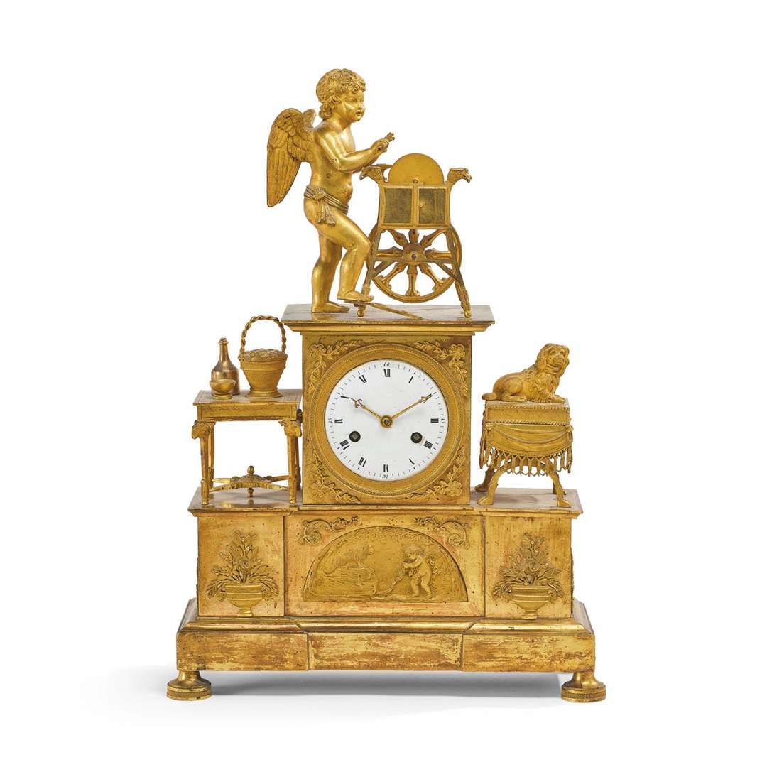 PENDULE À L'AMOUR RÉMOULEUR En bronze ciselé et doré, au sommet une figure de l'Amour ailé affutant (une flêche manquante) sur une meule qu'il actionne de son pied droit.