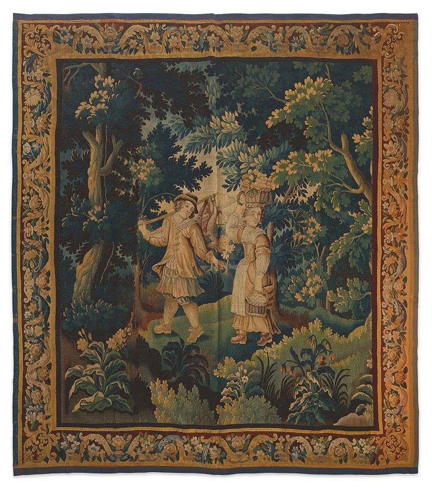 Ils sont entourés d'une belle et luxuriante végétation. Bordure à guirlandes et entrelacs de fleurs et feuillages en torsades et en forme de plumes stylisées. En laine et soie.