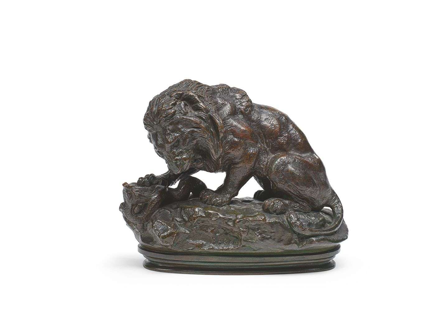 Lion au serpent n°2. Signé sur l'avant « Barye » et à l'arrière en cursive de la marque de l'éditeur « Dt Delesalle ».