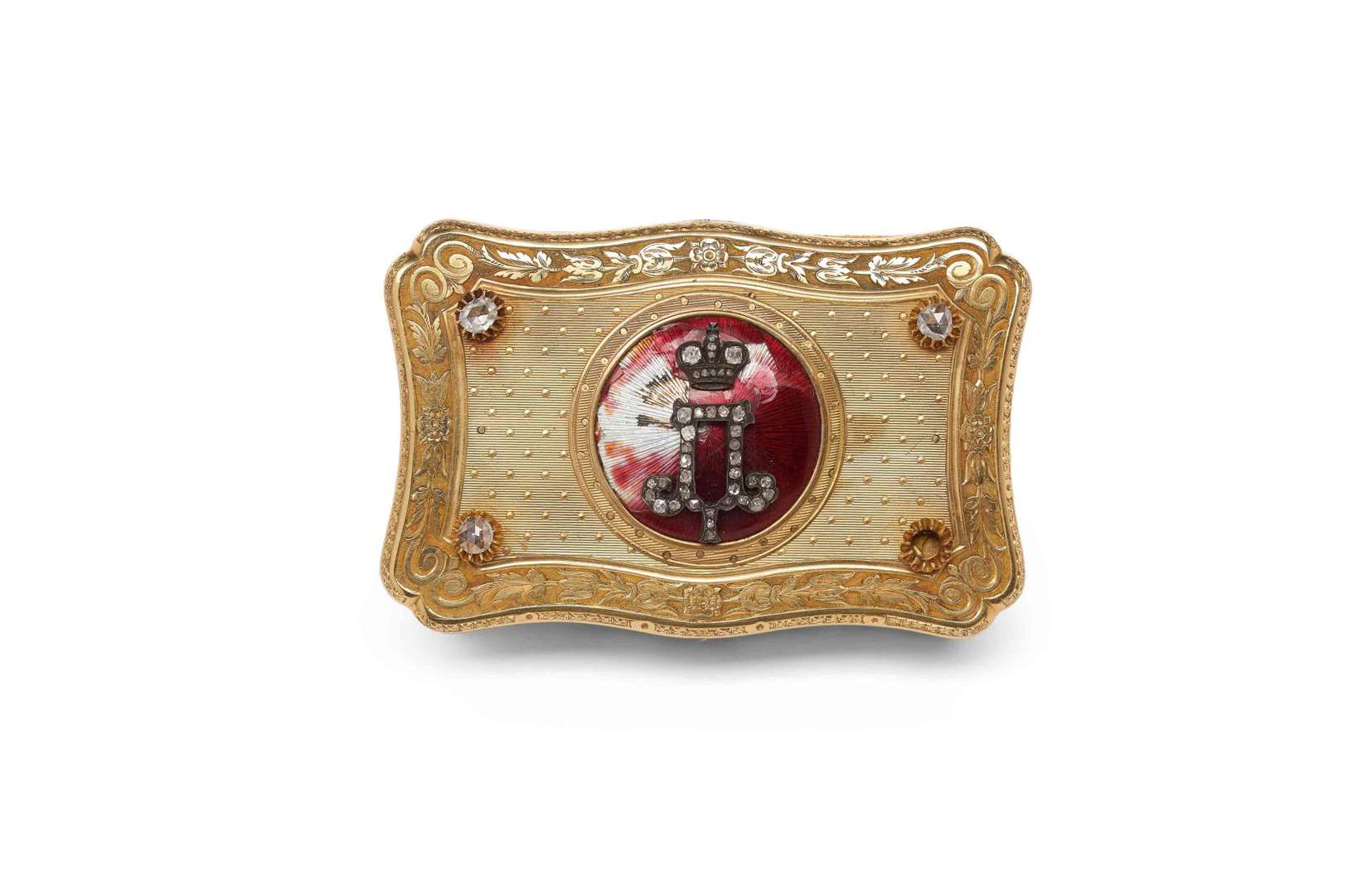 TABATIÈRE IMPÉRIALE RUSSE En or jaune de forme rectangulaire à bords contournés. Gravée sur toutes ses faces et finement ciselée aux trois ors de couleurs (blanc, vert et rose). Le couvercle est orné d'un médaillon central au monograme impérial du tsar Paul Ier (1754 - 1801) sertis de brillants sur un cercle d'émail translucide rouge (accidenté) sur fond guilloché.
