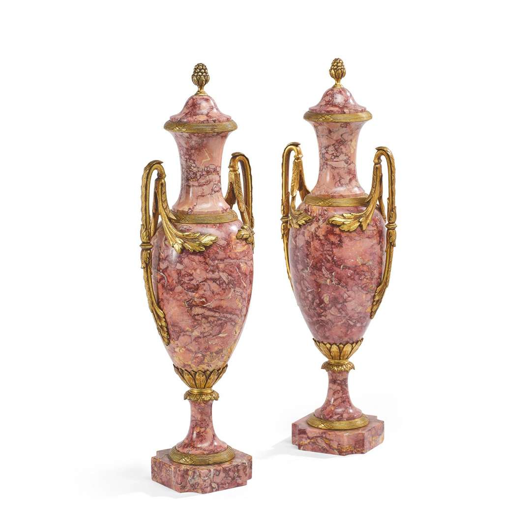 PAIRE DE FAUX VASES COUVERTS En forme d'amphore en marbre brèche violette monté en bronze doré.