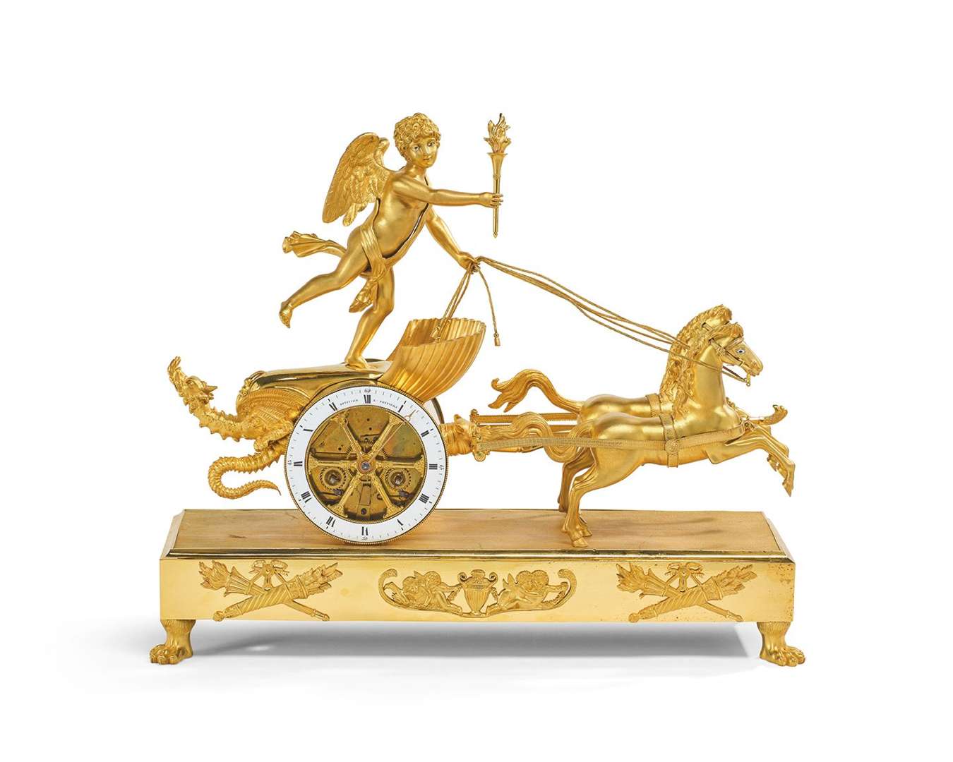 La caisse en bronze doré finement ciselé représentant le groupe de l'Amour ailé tenant la torche enflammée de la Passion, debout sur un char tiré par un attelage de deux chevaux au galop. L'arrière du char est un dragon d'après le modèle attribué au bronzier Jean-Simon Deverberie (1764 - 1824). La roue formant cadran dont l'extérieur est d'émail blanc et signé Duvivier à Poitiers. Terrasse rectangulaire reposant sur des pattes de lions.
