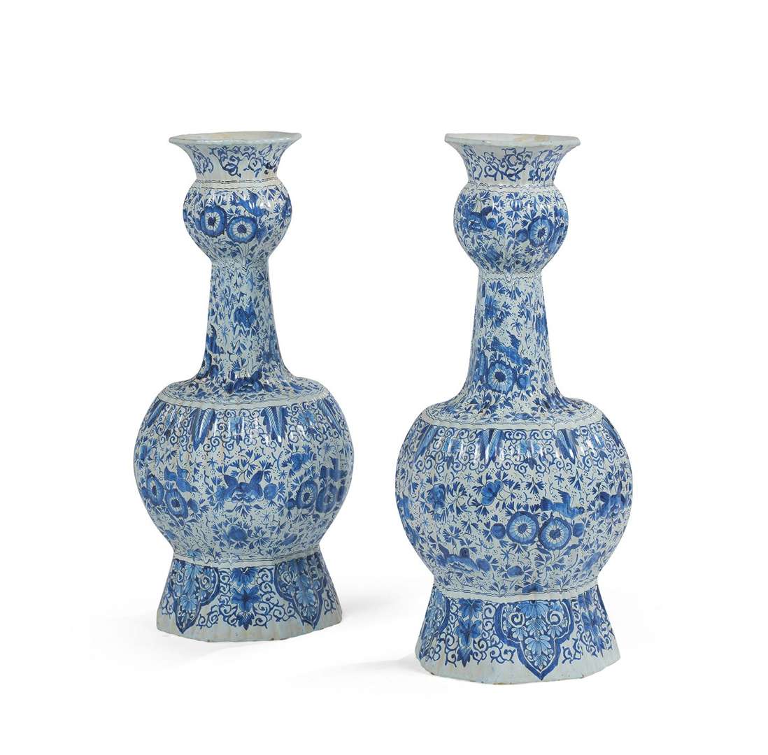 Chaque vase au pied à section octogonale, panse et long col étroit terminé par un bulbe entièrement cotelé et décoré en camaïeu bleu d'oiseaux, fleurs et rinceaux à la manière chinoise. Monogrammé AL au dessous.