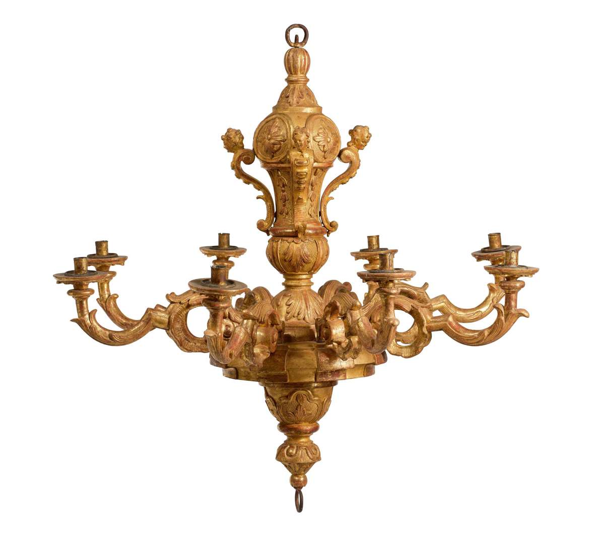 GRAND LUSTRE AUX ESPAGNOLETTES En bois sculpté et doré à huit bras de lumière rétractables, le fût en balustre aux espagnolettes issantes, fleurons et fleurettes sculptés. Anneaux de fer forgé.