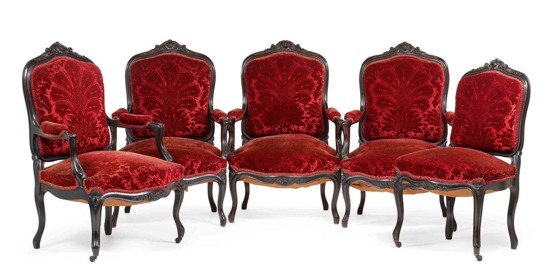 SUITE DE QUATRE FAUTEUILS En bois noirci, mouluré et sculpté à décor de style rocaille. Reposent sur des pieds galbés, les pieds antérieurs d'un se terminant par des roulettes. On y joint une chaise au modèle, les pieds antérieurs se terminant par des roulettes.