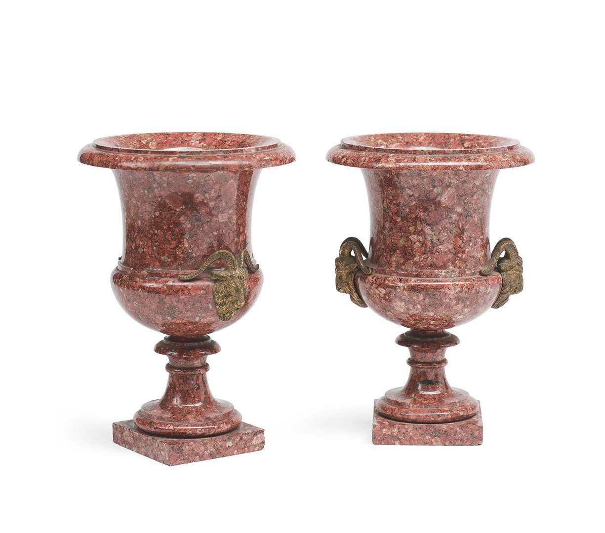 PAIRE DE VASES EN PORPHYRE DE SUÈDE de forme Médicis, les anses appliquées en bronze ciselé et doré aux visages de boucs.