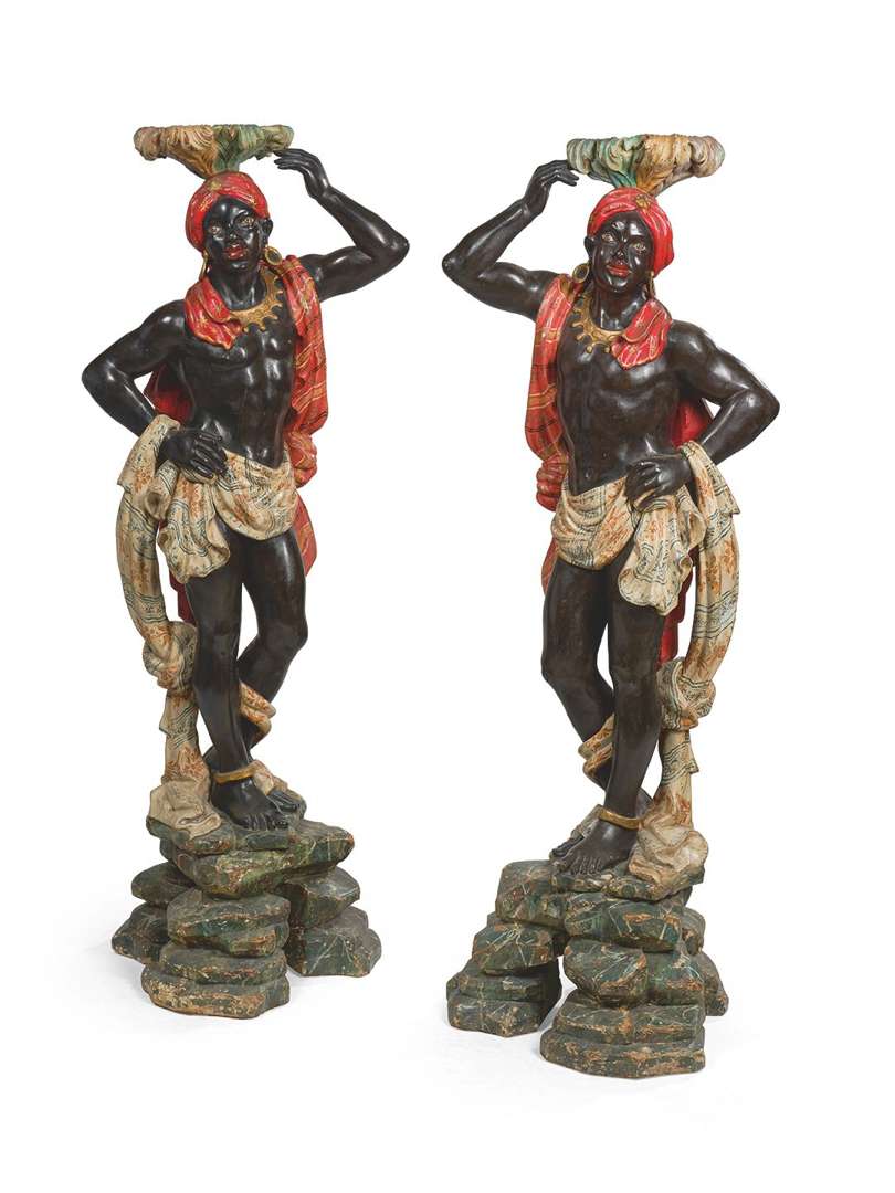 DEUX NUBIENS CANÉPHORES en pendant. Bois sculpté et peint polychrome.