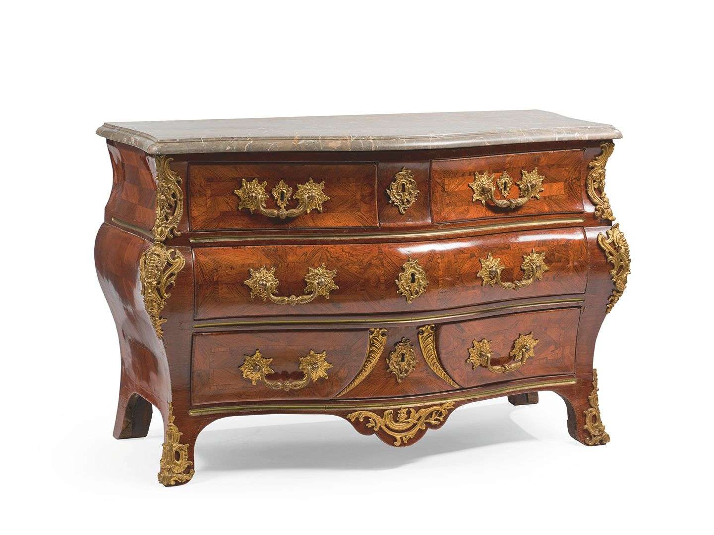 à moustaches, en placage de bois en feuilles dans des encadrements. Elle ouvre à quatre tiroirs sur trois rangs. Dessus de marbre brèche gris mouluré. Riche garniture en bronze doré (rapportée).