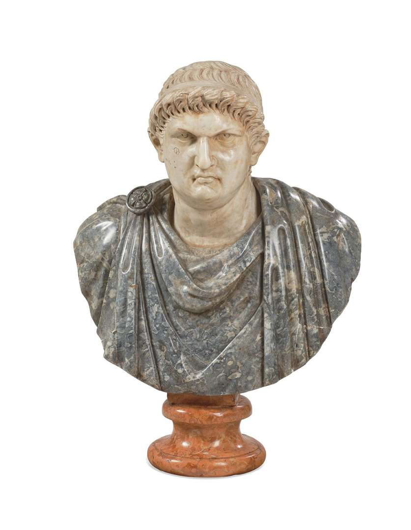 en marbres de différentes couleurs. Les têtes de marbres blanc, représentant respectivement Néron et probablement Marc Aurèle, sur piédouche circulaire (l'un branlant). On y joint deux grandes gaines colonnes de marbre rouge.