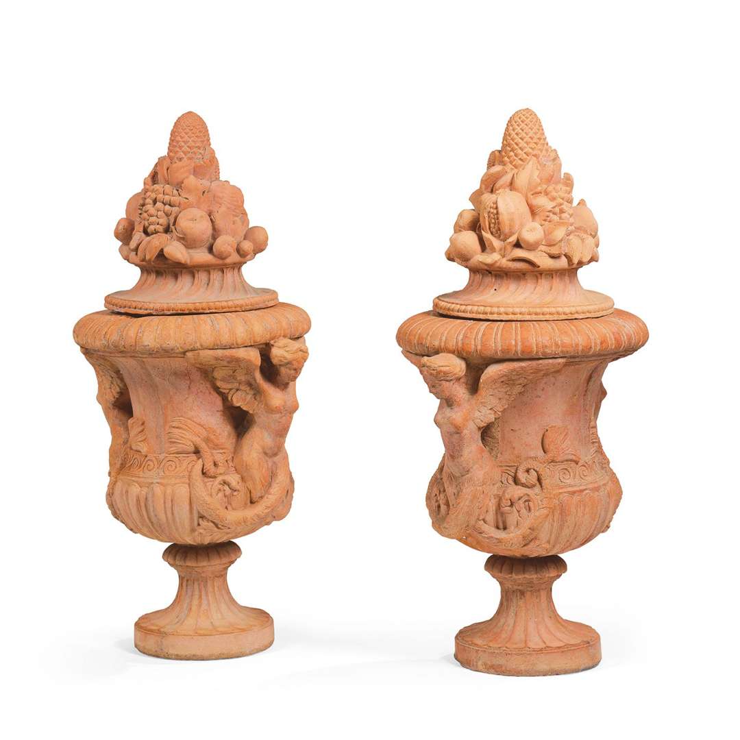 en mortier orangé à l'imitation de la terre cuite, les vases Médicis à décor de sirènes ailées en appliques et godrons, la partie supérieure (amovible) en forme de corbeille de fruits sur une base de godrons tors creux.