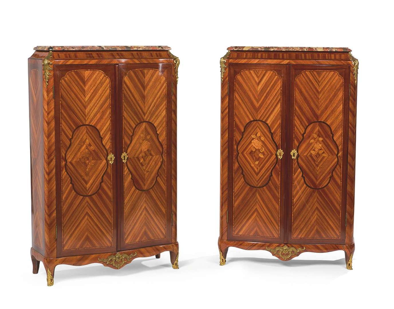 à hauteur d'appui à décor marqueté de satin et amarante. Ils ouvrent par deux vantaux et découvrent quatre étagères. Sommés de plateaux de marbre brèche d'Alep.