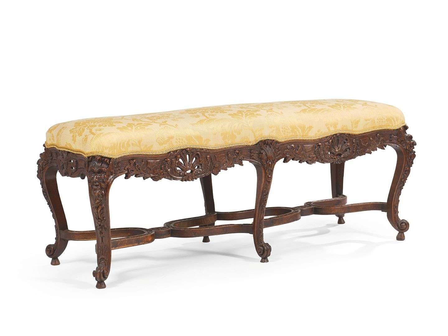 de chêne sculpté en bois au naturel, la ceinture entièrement sculptée de coquilles ajourées et feuillages. Les coins en masques de faunes grotesques. Elle repose sur quatre pieds cambrés terminés par des roquillards réunis par une entretoise en double X.