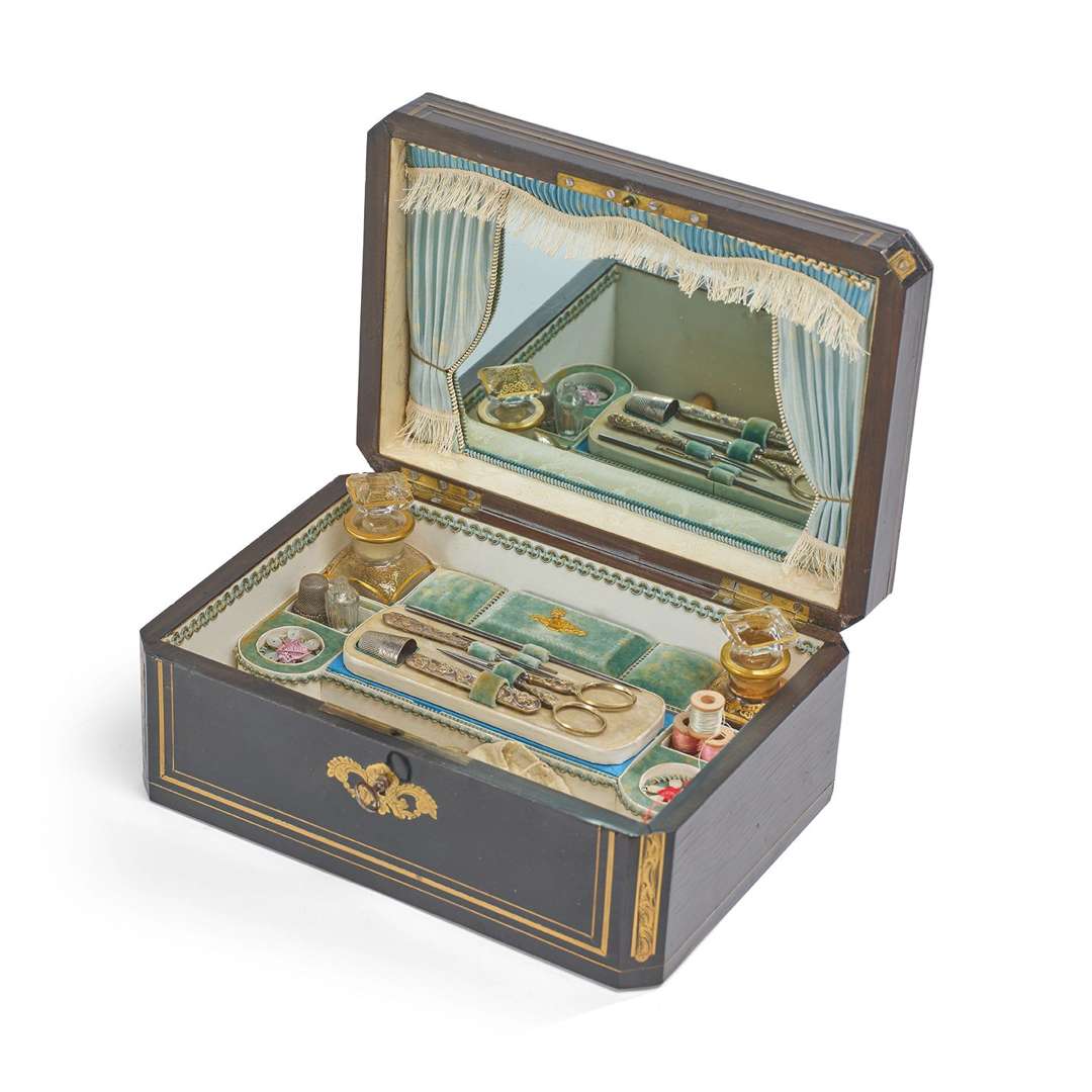 de forme rectangulaire en bois noirci à décor en incrustation de laiton. Il révèle un intérieur compartimenté doté d'ustensiles de couture et de deux flacons.