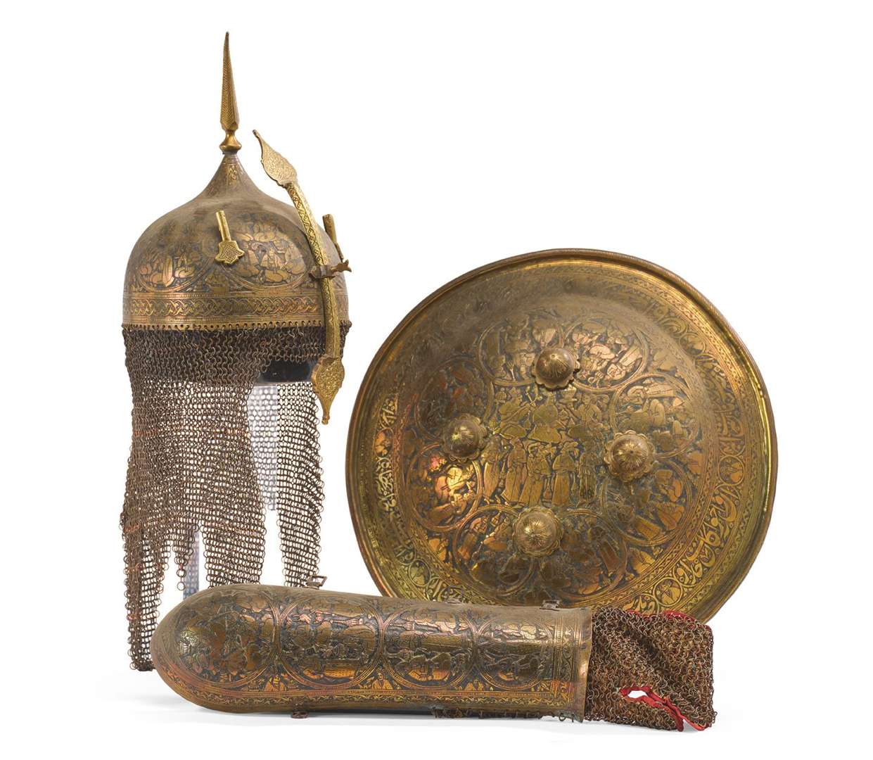 - Un casque à nasal, avec pointes et porte-plumets. Entièrement ciselé de cartouches représentant des scènes de vie à la cour. Il est bordé d'une cotte de mailles en alternance fer et cuivre. Diamètre : 16,5 cm.