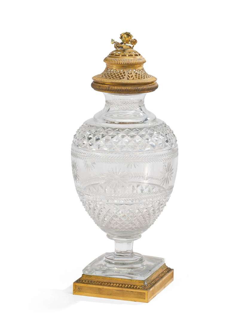 en forme d'urne en cristal taillé de pointes de diamants, fleurs et pastilles. Pied à section carrée monté en bronze doré. Couvercle ajouré de bronze doré à frétel en forme de fleurs.