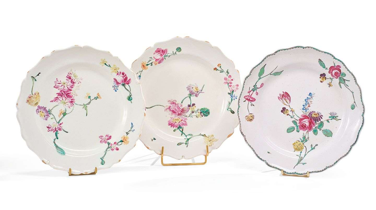 dont une paire en faïence blanche et décor peint polychrome de bouquets. Marseille, manufacture de la Veuve Perrin, fin du XVIIIe siècle.