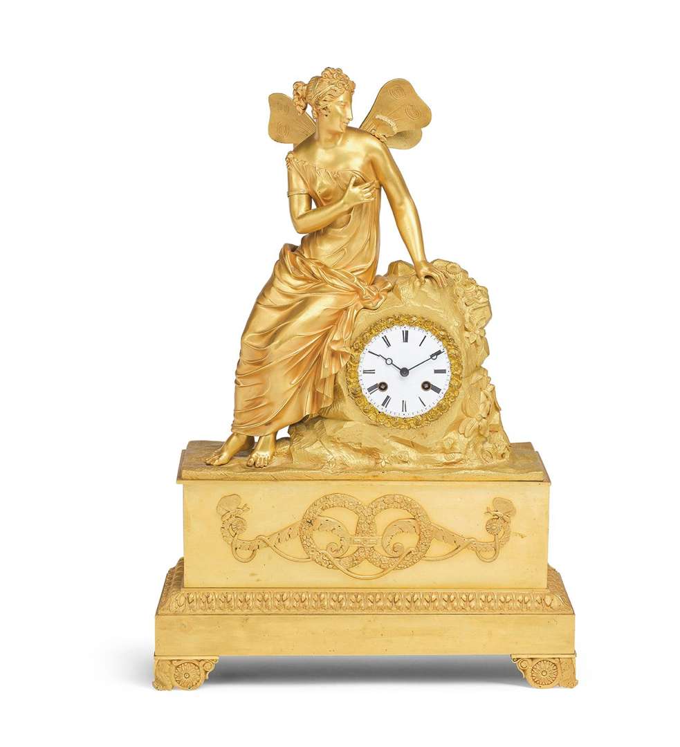 en bronze ciselé et doré ornée de Psyché assise sur un rocher dans lequel est inscrit le cadran.