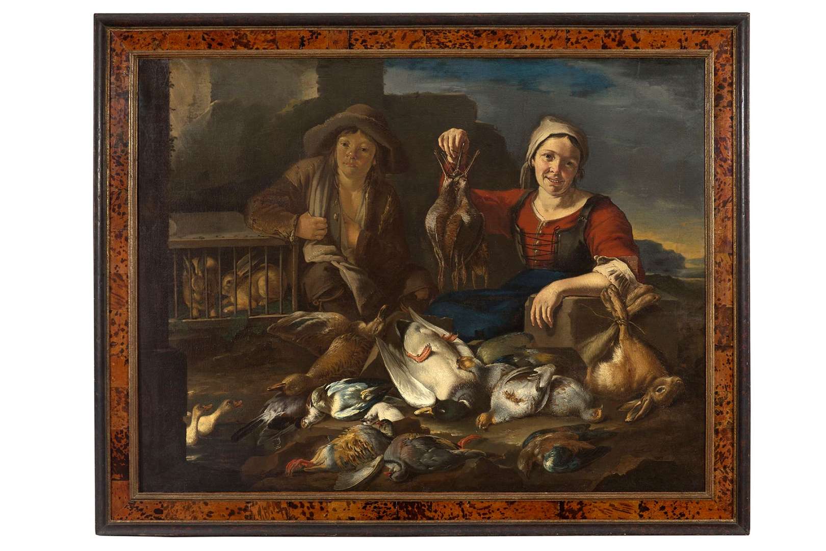 Aussi n'est-il pas étonnant de trouver ici un soin tout particulier apporté à l'étal qui s'offre devant nos yeux. Sans collaboration, l'artiste montre qu'il maîtrise à la fois la figuration humaine et la représentation animale. Ainsi, sur un fond qui n'est là que pour accueillir ses figurants, se trouvent une femme et un jeune garçon, établis au sol où ils rassemblent leur butin macabre. Ostentatoire, le premier plan nous propose toute une déclinaison de canards et volailles aux plumages chamarrés. Seuls intrus peut-être, le lièvre mort et les lapins encore vivants, attendant patiemment dans leur cage d'être emmenés avec le reste. Cipper montre qu'il sait aussi bien peindre un plumage qu'une fourrure, un animal mort qu'un vivant.