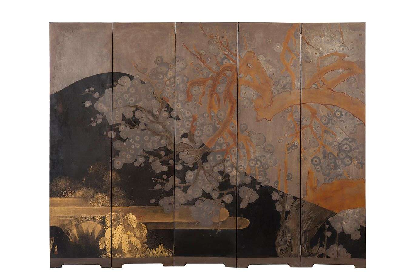 Laque à rehauts d'or et d'argent, paravent en cinq panneaux, signé en bas à gauche, contresigné au dos