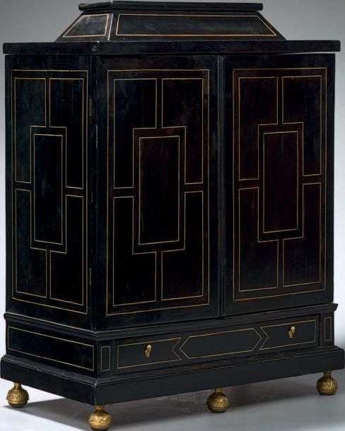 CABINET Ebène, ivoire, pierres dures et bronze H: 63 cm - L: 57 cm - P: 30 cm Italie (Florence) - c. 1650/60 Très bel état L'Italie est le domaine des décors précieux réalisés par la combinaison de bois d'ébène, de bronze doré, d'ivoire et de pierres dures ou de marbres de différentes couleurs. Le cabinet, coffre à compartiments, en est le meuble de prédilection. Ce modèle raffiné exprime clairement le talent des ébénistes. Petit meuble fait pour être posé sur une table, il présente une forme en sarcophage, une ouverture à deux battants et un soubassement de tiroirs porté par six pieds boules. Le décor délicat, blanc sur noir, inscrit sur le fond d'ébène un réseau de filets d'ivoire, créateur de formes géométriques sobres et élégantes. L'ouverture des portes révèle un univers enchanteur de couleurs, de dorures et de volumes disposés selon une stricte ordonnance architecturale. Statuettes et colonnes torsadées de bronze ornent la façade à tiroirs organisée autour d'une niche placée sous le fronton. Des moulures d'ébène guillochées soulignent les compartiments. Les pierres dures, parmi lesquelles lapis lazzuli, cornaline et jaspe, sont incrustées dans le bois et délimitées par des filets dorés. Ce ravissant cabinet, exécuté en bois précieux et habillé de panneaux de opera di commesso di pietre dure, caractérise les plus belles productions florentines du dix septième siècle. Référence: "Le cabinet de la Renaissance à l'époque moderne", Monique Riccardi-Cubitt, Ed. de l'amateur, 1993, p.59