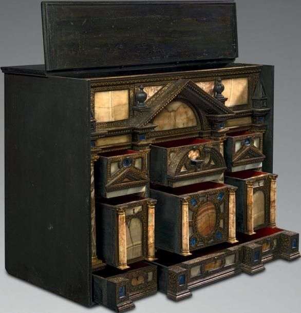 CABINET DE PIERRES DURES Bois noirci et doré, marbre, pierres dures, lapis lazzuli, marbre, nacre, jaspe... H: 61 cm - L: 75,5 cm - P: 40,5 cm Italie (Venise ou Rome) - XVIème siècle Très bel état, sérrurerie remplacée, plusieurs tiroirs à fond secret Les premiers cabinets sont de petite taille. En Italie, avec la technique du commesso, les artisans très spécialisés choisissent, taillent, sculptent et assemblent les marbres et pierres dures qui habillent les façades de ces "armoires des merveilles" aux nombreux tiroirs secrets. Ce splendide modèle en rend compte: le décor joue sur les assemblages de couleurs, de matières, de veinages, de transparence ou de luminosité. Ils s'organisent selon l'ordonnance architecturale d'une entrée de palais, chaque compartiment délimité par des cadres et des moulures de bois noirci couverts d'une fine résille dorée dessinée au pinceau. Le bleu de lapis rehausse le camaïeu des marbres, le poli des surfaces lisses assagit le volume mouvementé des colonnes veinées. Association somptueuse et délicate, elle cache en trompe l'oeil tout un monde de tiroirs et de compartiments. Deux tiroirs inégaux s'inscrivent dans le soubassement, surmontés de trois tiroirs fermant à clé. Donc, pas de porte et pas de niche dans la partie centrale, tout l'ornement est en façade. Le dessus fonctionne comme un coffre peu profond, auquel on accède par l'abattant qui coiffe le meuble. Ce rare objet appartient à la famille des plus anciens cabinets italiens de la Renaissance, dont les décors à "marmi mischi" représentent l'innovation la plus importante apportée par la culture italienne à l'art européen baroque.