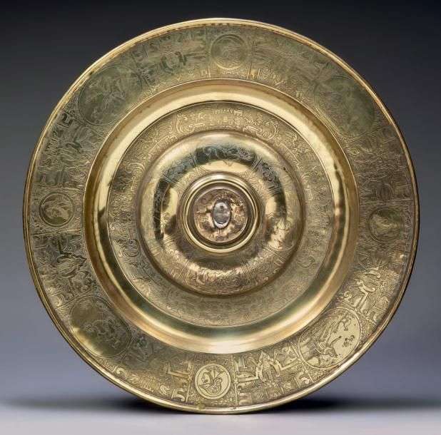 PLAT RENAISSANCE Laiton gravé et inclusion d'argent D: 54,5 cm Allemagne - XVIème siècle Très bel état Rarement plateau a connu un décor foisonnant d'une telle finesse. La couronne de l'ombilic et le marli se divisent en secteurs réguliers, composant quatre quartiers. Le principe de symétrie ordonne chaque composition. Sur le marli, des médaillons circulaires présentent des profils de guerriers casqués, tous différents. Des scènes allégoriques s'inscrivent dans les cartouches ovales séparés par les mêmes motifs de cuirs découpés et de grotesques. Elles figurent les quatre parties du monde, Amérique, Afrique, Europe et Asie, thème très en vogue à la Renaissance avec les voyages d'exploration et la conquête de terres nouvelles. Autour de l'ombilic, alternent cartouches de dieux marins et grotesques. Les registres circulaires continus sont, l'un totalement lisse et brillant, l'autre peuplé de volutes, de figures fantastiques et de mascarons. Au centre de l'ombilic, une inclusion d'argent devait porter à l'origine les couleurs d'un blason. Ce grand plateau délicatement ciselé devait supporter une aiguière pour le lavage des mains, rite indissociable du cérémonial de purification qui précédait tout repas raffiné.